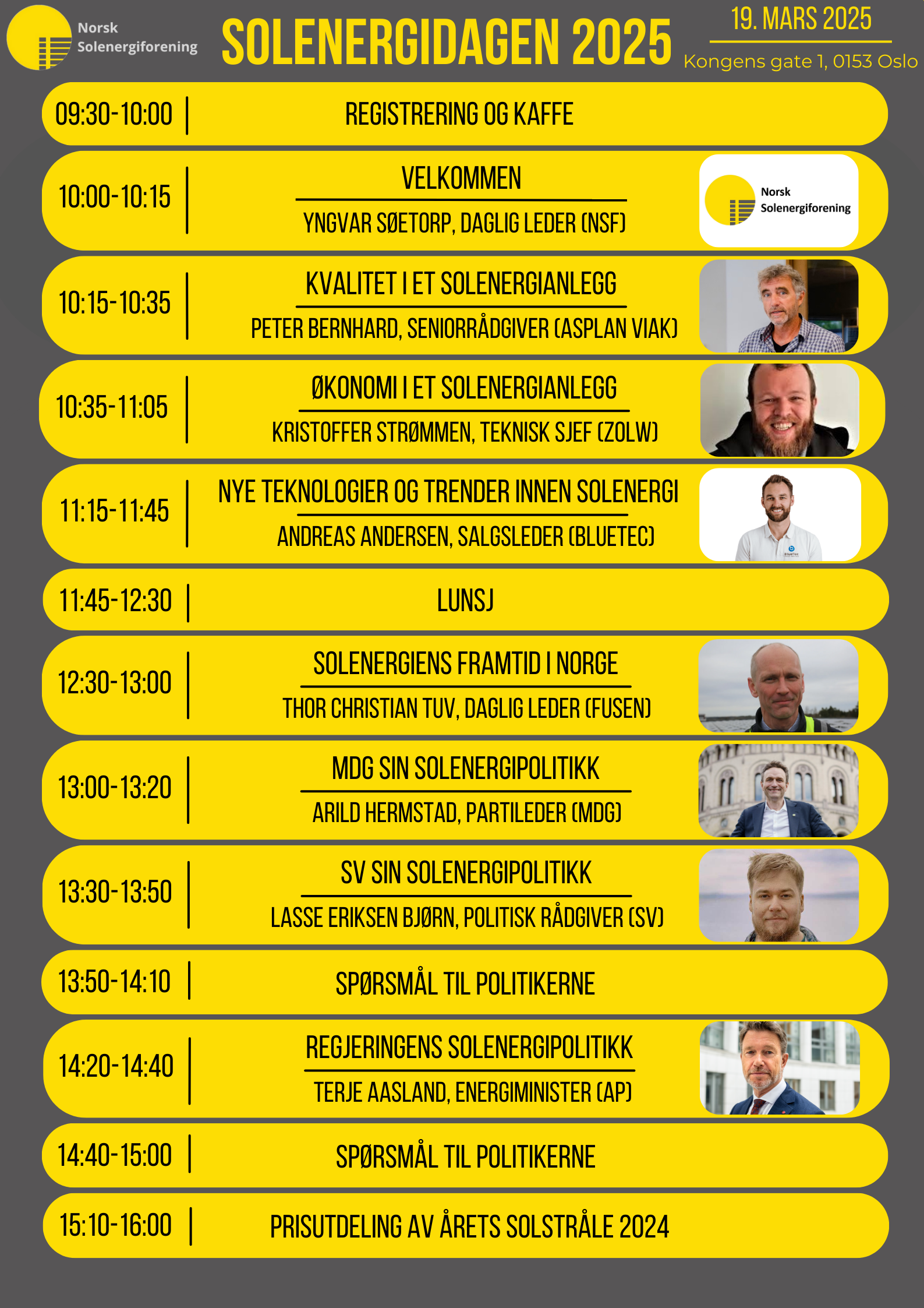 Velkommen til Solenergidagen 2025! Dette er dagen der alle sol-entusiaster samles for å diskutere, informere og lære om solenergi i Norge - uansett hvilket aspekt. Vi ønsker dermed alle med engasjement for solenergien i Norge, lite som stort, hjertelig velkommen.